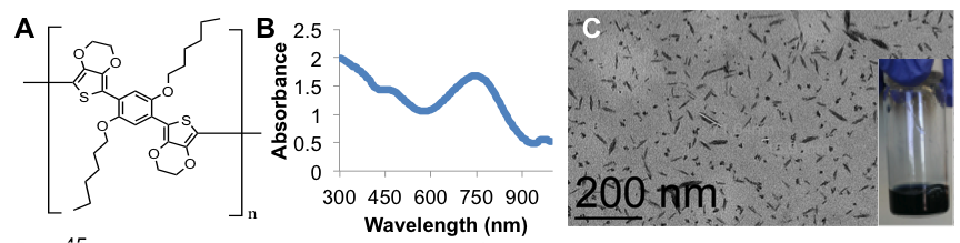 Figure 1. (A) Structure of conductive polymer. (B) Absorption spectrum of nanostructures in suspension. (C) Transmission electron microscopy image of nanostructures. (D) Cytocompatibility of nanostructures in SKOV-3 ovarian cancer cells. (E) Photothermal response of nanostructure suspension.