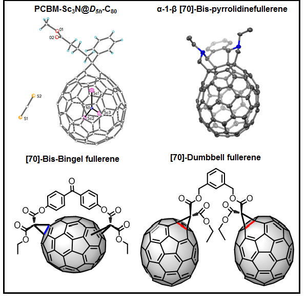 We have separated Sc3N@D5h-C80 from Sc3N@C68 based on their chemical reactivity differences using the p-toluenesulfonyl tosyl hydrazone of phenyl butyric acid methyl ester (PCBM). We also performed for the first time the synthesis and characterization of five PCBM methano-derivatives of Sc3N@D5h-C80 (including the X-ray diffraction structure of one of the isomers) and two PCBM methano-derivatives of Sc3N@C68. We also synthesized four easily isolable regio and stereoselective pure bis-adducts of C60 and C70 and a new C70 dumbbell using two different malonate tethered moieties. |