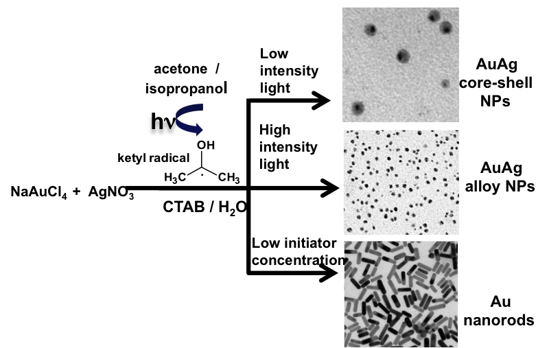 - Group 11 metal nanoparticles (Au Ag and Cu NPs), bimetallic (AuAg core-shell and alloys NPs with varying composition) and anisotropic nanoparticles (Au nanorods of various aspect ratio) have been prepared using photochemically generated ketyl radicals.