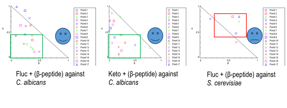 Fungal infections such as candidiasis represent an important human health concern worldwide due to high mortality rates, of more than 50%, specifically in those people who are immunocompromised. In particular risk are those patients undergoing chemotherapy, that suffer from AIDS and those who receive an organ transplant. Other concerns include the side effects of the current antifungal drugs and the emergence of multidrug resistant organisms. Current approaches to antimicrobial treatments have employed combination drug therapy to enhance the efficacy of antimicrobial agents. Antimicrobial β-peptides, a novel material that mimics naturally occurring antimicrobial peptides, have been found to interact synergistically with azole-containing antifungal drugs. The figures above show isobolograms representing the effect of a combination treatment of C. albicans with a model β-peptide and two commonly used azole drugs (fluconazole and ketoconazole). Our experiments demonstrate that inhibitory concentrations of the combination treatments are lower than those of the agents alone in the case of C. albicans. Interestingly, this effect is not observed in the case of Saccharomyces cerevisiae. These results are a promising alternative to the development of new treatments for fungal infections.