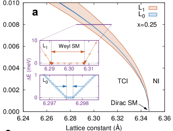 Outcome: In collaboration with experimental studies at Princeton University we have carried out ab initio calculations to examine the effect of pressure on the topological phase diagram of Pb1-xSnxTe. The calculations reveal that the ferroelectric polarization, which breaks crystal inversion symmetry, induces a Weyl semimetallic state separating the normal insulator and topological crystalline insulator phases. The metallic phase features pairs of Weyl nodes of opposite chiralities which persist over a finite pressure range. Hence the metallic phase is protected since the Weyl nodes cannot be removed except by mutual annihilation which occurs at higher pressure.