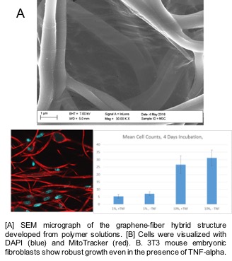 [B] Ternary nanofibers permit cell proliferation even in the presence of TNF-a. When grown with 10% serum supplementation, 3T3 mouse embryonic fibroblasts show robust growth on ternary composite nanofibers, even in the presence of cytokine TNF-a. This suggests that nanofibers may act to sequester inflammatory cytokines, thus promoting wound healing in diabetics (Project directed by Robert Gilkerson).