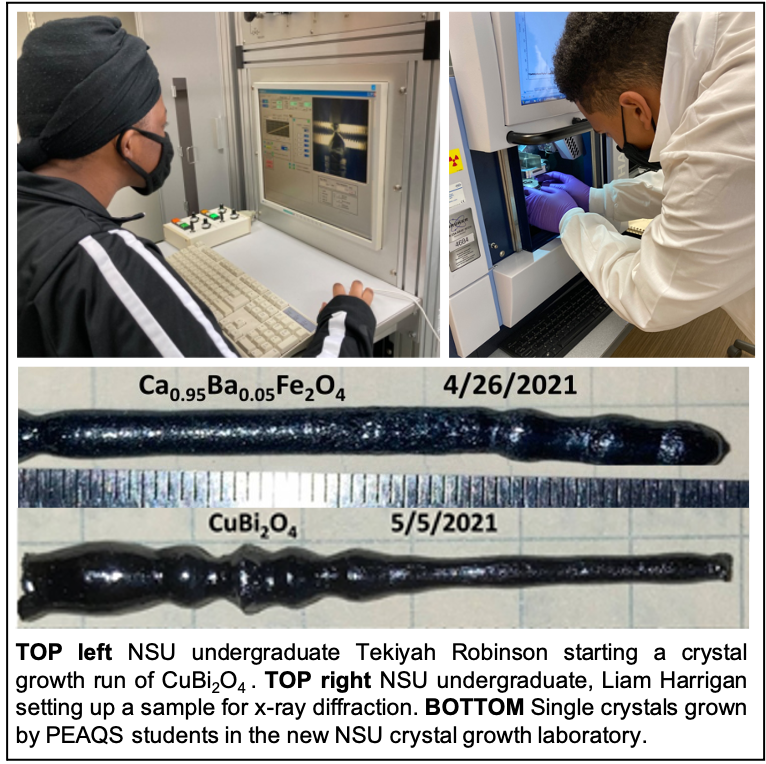 PEAQS has successfully leveraged the new laboratory space allocated to the project during years 1 and 2 to begin a successful program in single crystal growth of quantum materials. This work has also led to the award of a $500k Department of Defense instrumentation grant for a new x-ray powder pattern diffractometer and an x-ray single crystal Laue diffractometer which are needed for characterization of the the crystals grown by PEAQS students. The Laue diffractometer will be the only one in the located within a 500 mile radius of NSU. Additional laboratory space for the the project has been allocated for installation of the x-ray equipment on the first floor of the NSU McDemmond Center for Applied Research. Additionally, the crystal growth results were reported by students in two posters and one talk at the spring MRS conference.
