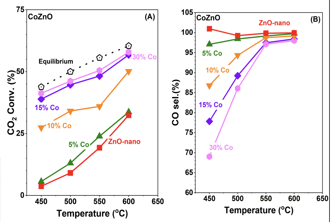 Results: The Co-doped ZnO shows tunable catalytic activity for the reverse water gas shift reaction. As conversion efficiency increases, selectivity decreases.