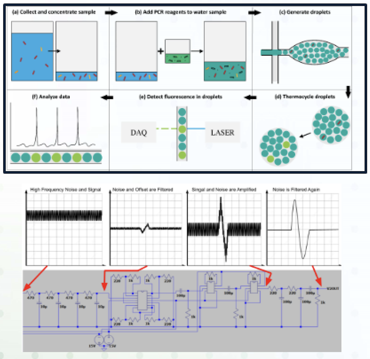 The undergraduate researchers at Fort Lewis College developed a microscope and an optical signal detector circuit to quantify single bacterium in microdroplets from environmental water samples (top).