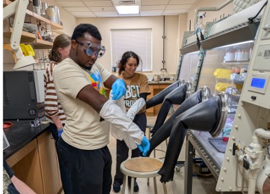 NSU and FLC students prepare to assemble batteries in chemical glove boxes.